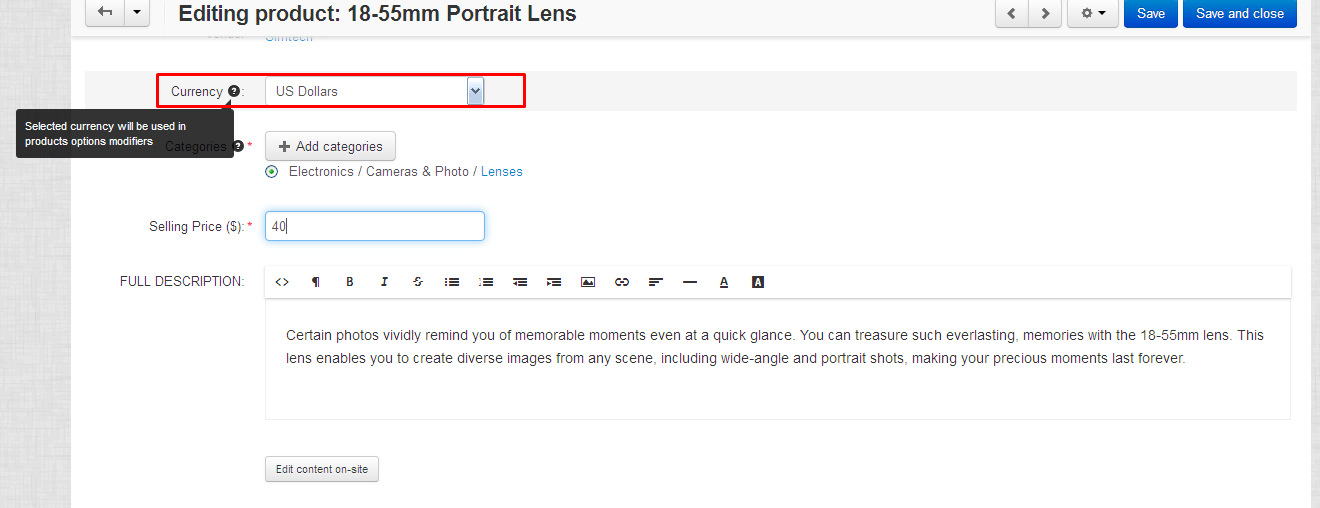 - Choose a currency on the product edit page;